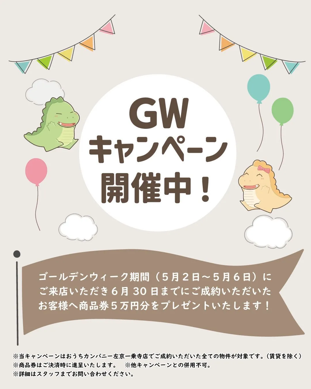 🎏GWキャンペーンのお知らせ🎏⁡ゴールデンウィーク期間(5月2日〜5月6日)におうちカンパニー左京一乗寺店にご来店いただき、6月30日までにご成約いただいたお客様へ商品券5万円分をプレゼントいたします🎁⁡\…